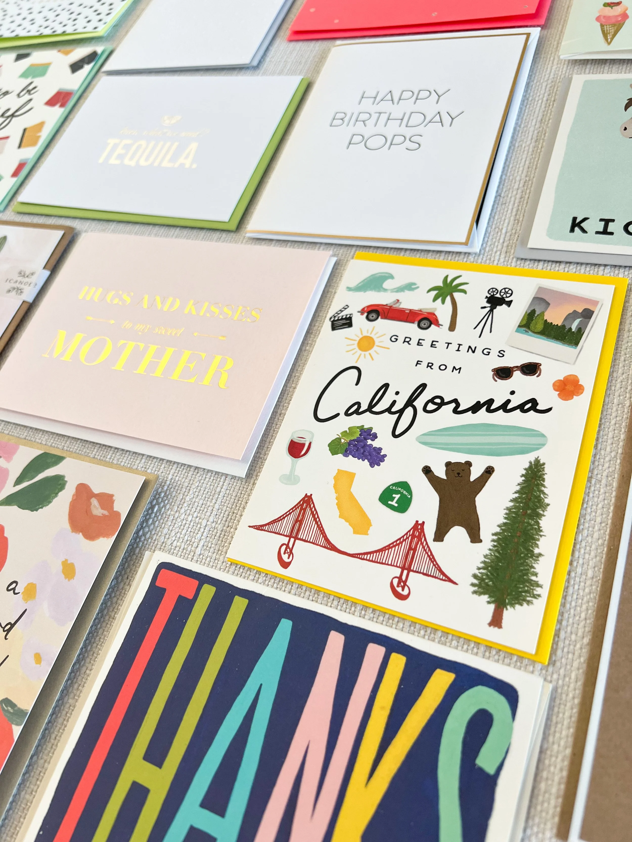 You’ll receive 3 fresh greeting cards and coordinating stamps, delivered straight to your door.